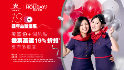 最新推廣資訊2 Min Read HKAHolidayson4 11 月, 2025 香港航空19周年推廣優惠 “1+9″主題優惠,覆蓋19+個航點 機票高達19%off外,更有9個主題優惠,再享額外多重賞 指定航點特惠機票高達19%off,來回由 HK$400 起*,「機+酒」套票再有額外 8% 折扣!仲送香港航空機場貴賓室「遨堂 Club Autus」使用券*…