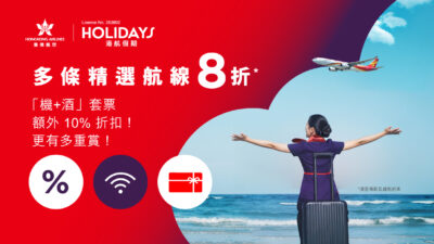Special Service Bookings1 Min Read HKAHolidaysonJanuary 13, 2026 港航 Early-Bird Sale 2026 精選航線8折*,覆蓋20+個航點 機票高達20%off外,「機+酒」套票更有額外折扣,仲追加 [3] 重禮遇 指定航點特惠機票高達20%off,來回由 HK$290 起*,「機+酒」套票再有額外 10% 折扣!仲送香港航空機場貴賓室「遨堂 Club Autus」使用券* 按此立即預訂…
