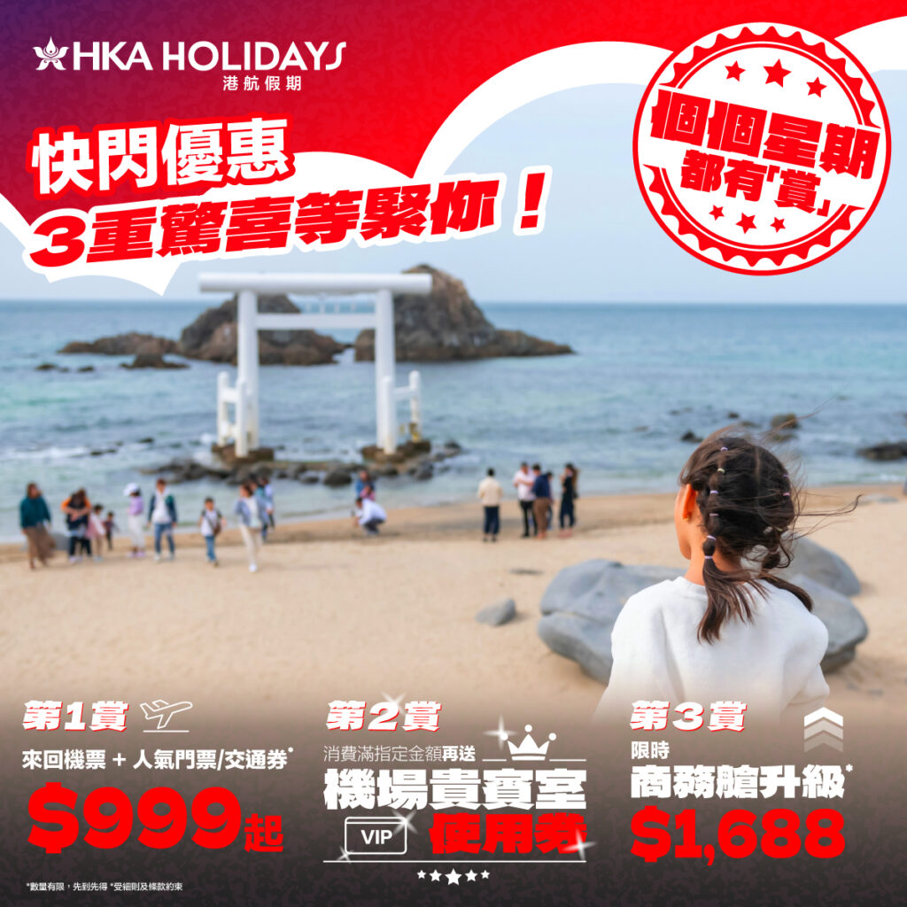 個個星期都有‘賞’!福岡機票優惠HK$999* 起含#主題樂園門票/交通券, 兼享 #機場貴賓室使用券 • #限時商務艙升級優惠只需額外 $1,688